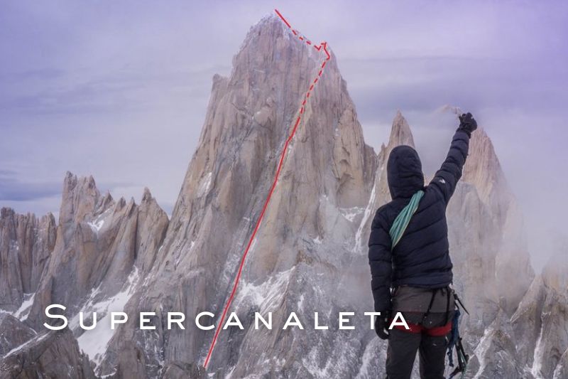 This route is another formidable path up Mount Fitz Roy, known for its extreme conditions and high technical demands. It starts with a steep approach through mixed terrain including rock, ice, and snow.